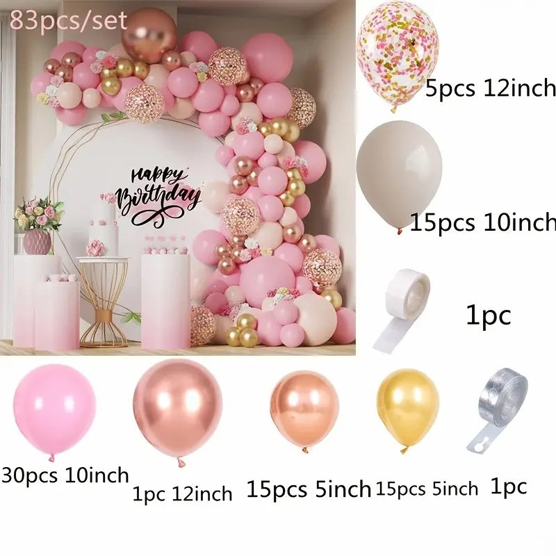 - 83 pcs of white, gold, pastel pink, and transparent balloons, along with assembly tools.